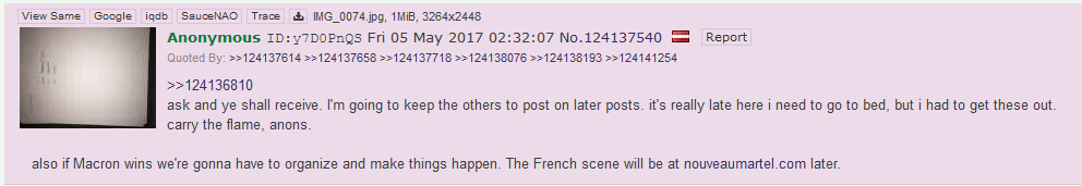 Figure 1: One of the posts by the anonymous user who originally uploaded the leaked En Marche documents to 4chan[1]